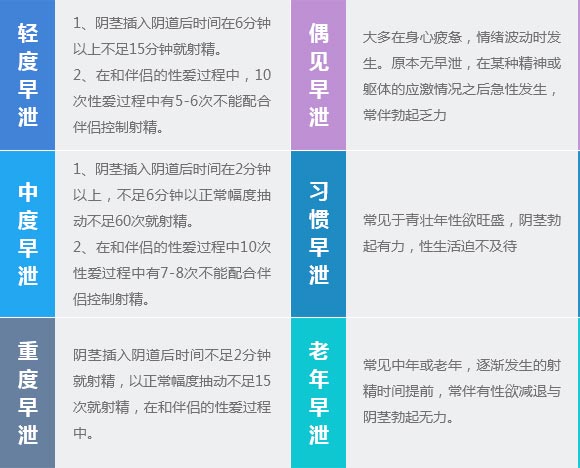 临床早泄分为轻度、中度、重度早泄;又分三大类偶见性、习惯性、老年性早泄,症状如下: