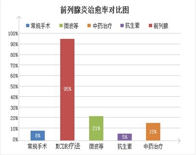 接受MCDR脉冲导融光能治疗机治疗的前列腺炎患者97%以上效果显著,疗效跟踪发现康复率达到98%。经过10000余例患者临床验证,率不足1%。治疗后期继续跟踪,完全无并发症和后遗症,是其他各种疗法所无法比拟的。