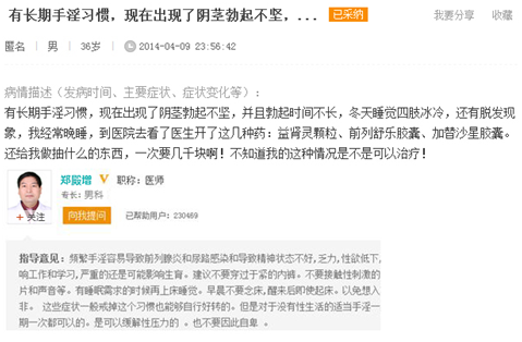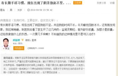 上海九龙医院 电话询问【他的案例】一位网友姜先生网上询问,长期手淫习惯,出现了阴茎勃起不坚,而且勃起时间不长等。医生告知易有早泄现象,具体情况需来院面诊。我也有类似情况,怎么办?