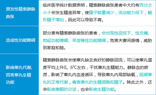 据相关文献表述:精索静脉曲张是男性不育的首位原因,在原发性不育症患者中占35%,继发性不育患者中占50%-80%。由此可见,不管是原发性精索静脉曲张还是继发性精索静脉曲张,都会对男性的生殖健康产生威胁,其危害不可小觑。