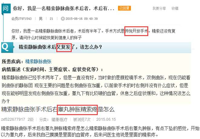 网友询问:精索静脉曲张术后又有了?手术半年后还没有恢复,多久恢复?术后两年了还没有怀孕?术后阴囊肿胀引起后遗症……