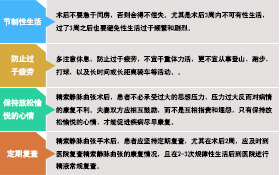 陈希求医师说:精索曲张术后康复率跟患者术后的护理是十分重要的。精索静脉曲张患者在术后要保持心情放松舒畅,注意饮食调整,不要吃辛辣刺激性食物,戒烟戒酒,不要长时间站立和坐立,注意劳逸结合。在术后一段时间内较好不要有过度频繁的房事,也不要经常手淫,保持阴囊和睾丸的清洁。随时注意自己的病情,询问医生及时进行病情沟通,一旦出现的病症一定要及时到医院进行复诊。医生精索曲张后多久能过性生活?一周就过了性生活有影响吗?