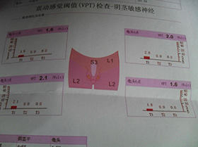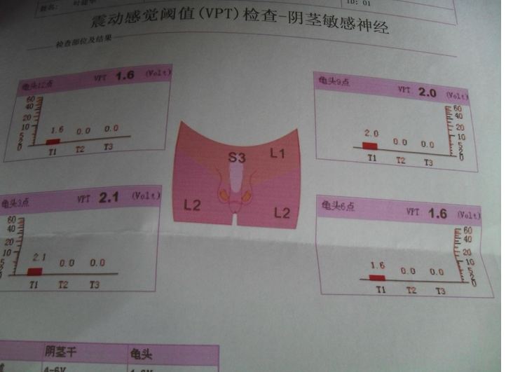 检查诊断:初诊患者包皮过长,再做性激素检查以及阴茎敏感神经测定;检查中发现性激素6项均在正常范围。阴茎敏感度检查为右阴茎干VPT2.7.左阴茎干VPT2.3,右龟头VPT2.2,左龟头VPT,1.8,阴茎敏感度高,诊断为原发性器质性早泄。