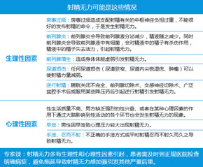 上海九龙医院 电话询问上海九龙医院泌尿外科医师韩用涛主任指出:射精无力也可称部分射精不全,它的特征是泄精正常而射精阶段异常,属于射精障碍。表现为在行房中情欲达到高峰而射精时却没有足够的力量将精液射入女性的阴道内的现象,常伴随这些症状:遗精、射精疼、 精液少、 器质性早泄、 精液稀等,主要由于生理性因素和心理性因素引起。射精无力可能会继发性欲减退、导致性冷淡甚至阳痿,影响夫妻感情,严重的由于射精无力导致精子精液无法正常运动从而影响生育等,患者需重视。我要直接和主任对话,点击进入医师免费询问专区