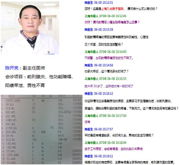 【及时就诊,及时治疗】6月8日,张先生通过上海九龙医院网络在线医师陈开亮主任的初步诊断病症是由泌尿系统感染引起的炎症,具体诊断需来院面诊。三天之后,张先生来院检查治疗,陈主任负责就诊,建议做尿常规检查进一步诊断,结果显示:尿白细胞增多,显示为阳性,尿PH值超大于7.5,超出正常范围。终诊断为尿道炎。