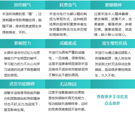 以上都是过度手淫带来的危害,如果依旧不加节制,继续痴迷继续消耗,只会不断透支健康,保护自己从预防疾病开始!很多曾经的“撸管”大汉,如今变成了“早泄公子”,别再让悲剧重演!早泄患者哭泣,时间都去哪了?还没来得及享受就早泄了!>>>我手淫好几年了我想问问在线医师,立即进入免费医师询问专区