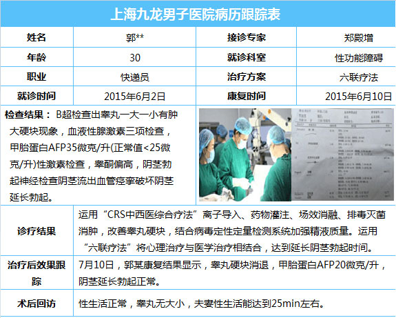 患者自述:因为工作的忙碌忽略了自己的健康,4年前睾丸肿胀压痛,检查患有睾丸炎医生说要手术治疗,因为对手术不放心担心费用,让医生开了些药物治疗。后来断断续续不舒服,也没有引起自己的注意。去年回家与相亲的女友结婚,婚后性生活一直不和谐,每次老婆没什么感觉,我就控制不住射精了。