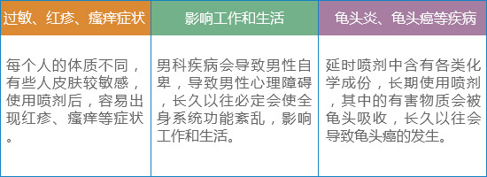 早泄延时喷剂只是一种治标不治本的即时方法,使用过多会对男性的龟头造成一定损害,让其敏感系数降低!有些人长期使用还会出现过敏反应,甚至会对女方的阴道和子宫造成伤害;更有甚者还会引起其他病症,反而得不偿失!使用早泄延时喷剂并不能从根本上解决男性性功能障碍问题。想要及时解决早泄问题必须去正规、设备健全的男科医院做相关检查,从根本上找出早泄病因,做针对治疗!我院,即上海九龙医院拥有强大的医护团队、优良的医疗设备和舒适的就诊环境,一定能患者的早泄病情!