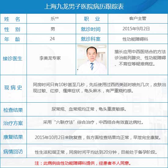 上海九龙医院 电话询问十一时我接诊了一位在酒吧工作的年轻人,他接触了无数个女孩子,先后和他在一起过的也有七八个。每次交往时间不超过3个月。原来是年轻人在性生活方面满足不了其女友要求。有早泄问题,可未到医院诊治,每次只使用延时喷剂,中药类、西药类的都用过。但病情变得更加严重,一接触到喷剂龟头很不适,伴有严重烧灼感,现在龟头变得特敏感。女方再不愿有喷剂和身体接触,喷剂让女方阴道也很不适。后他来我院,向我诉说了事情原委,想要寻求治疗方法。喷剂对身体造成的不适感应该怎么缓解?想了解具体治疗信息