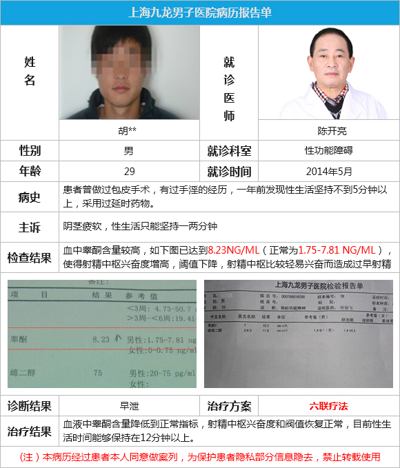 胡先生奔波过许多的医院,却终究没有效果,直到有一天在网上询问到了上海九龙医院的陈开亮医师,听完陈主任的话后,胡先生感觉自己还是有希望的。在2014年5月胡先生来到上海九龙医院见到了陈开亮主任,虽然诊室并无其他人,但他还是有点羞于启齿的感觉,在陈主任的安慰下,他才缓缓道出事情原委,随后陈主任就安排他检查治疗。我也想预约陈开亮主任,点击这里进行预约挂号》》》