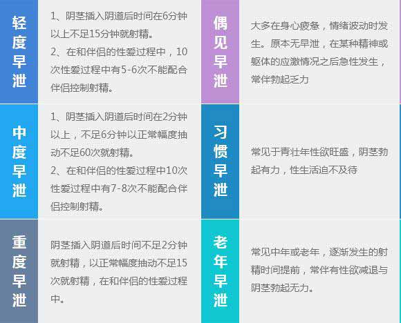 以时间为标准:指总是或者几乎总是发生在插入阴道以前或插入阴道3分钟以内,完全或几乎全部缺乏控制射精的能力;