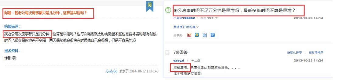 【才是新婚如今却分床睡】2015年5月2日下午,上海九龙医院网络在线医生接到了一名“江西客人小金”的询问,他说自己和老婆结婚不到三个月就分床睡了!原因是自己房事不行,和老婆同房时每次刚进入阴道不到1分钟就射了,继续尝试再三仍然以提早射精结束,这个状态婚后一直持续没有改善过。老婆怪他这方面不行婚前却刻意隐瞒,觉得自己成了“同妻”被骗了目前一直处在冷战状态。我有疑问,在线询问医师!