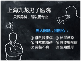 上海九龙医院是一所集预防保健,医疗,康复服务为一体的现代化综合男性专科医院。医院以"专病专治"为特色,全心致力男性六大男科疾病的研究与临床诊治,秉承“弘扬医德、尊重科学、诚信求精、毕生奉献”的办院宗旨一直服务于全国男性朋友健康的一线,为每一位到院的患者提供有效的诊疗方案,达到治好疾病的目的。立即预约治疗,点击预约